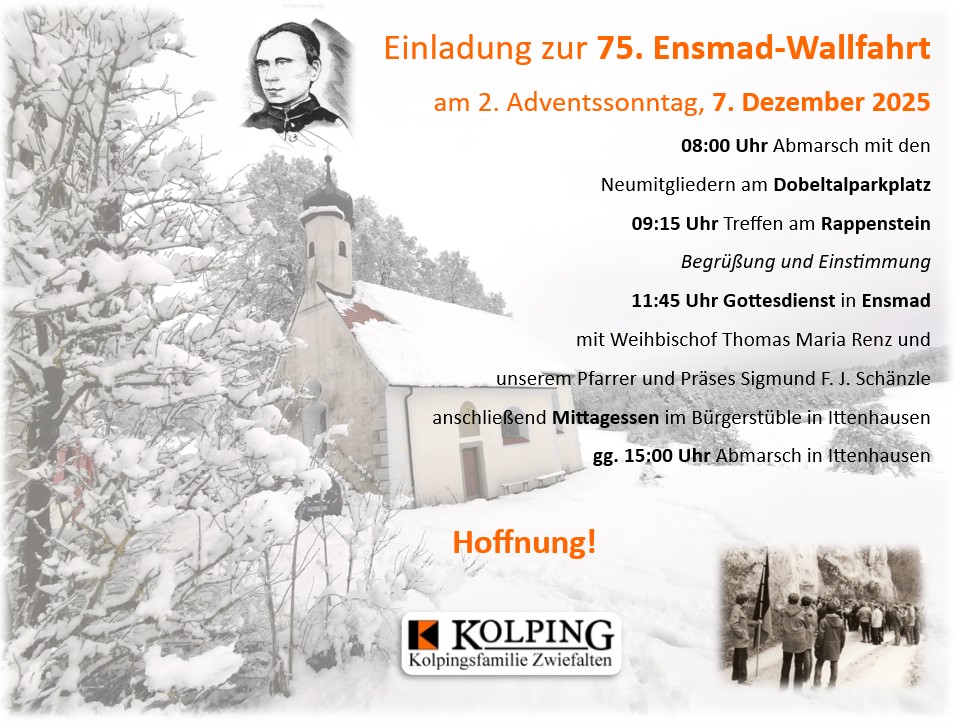 Seit dem Jahre 1951 pilgert die Kolpingsfamilie Zwiefalten Jahr für Jahr zu Fuß nach Ensmad. Der Grund ist ein Versprechen vom 21. Oktober 1951. An diesem Tag verunglückten die beiden Kolpingsöhne Paul de Temple und Eberhard Walz bei einem Motorradunfall so schwer, dass Eberhard verstirbt und Paul lebensgefährlich verletzt wird. Um des Kolpingbruders Eberhard zu gedenken und für die Genesung von Paul zu beten, gibt die Kolpingsfamilie Zwiefalten das Versprechen ab, am 2. Dezember 1951 eine Wallfahrt nach Ensmad zu machen. Das Anliegen wird erhört und Paul de Temple überlebt den Unfall.
