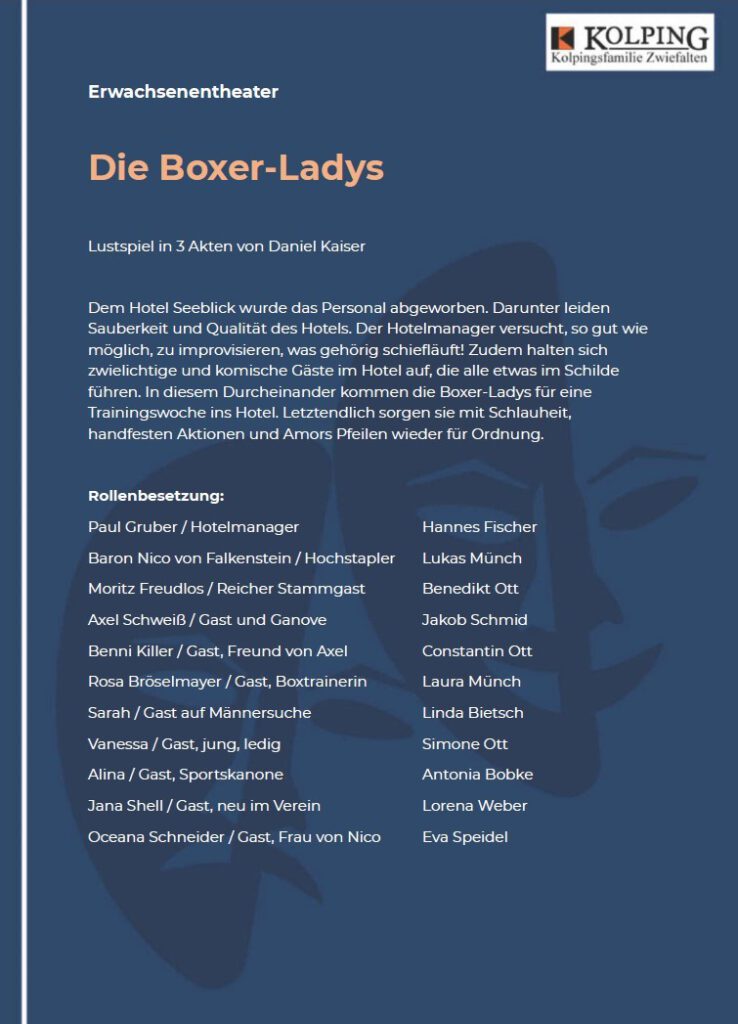 Das Erwachsenen- Theaterstück, aus der Feder von Daniel Kaiser, heißt in diesem Jahr „Die Boxer – Ladys“. Das Stück lässt kein Auge trocken. Freuen Sie sich auf die Talente die das Kolpinghaus zum beben bringen.