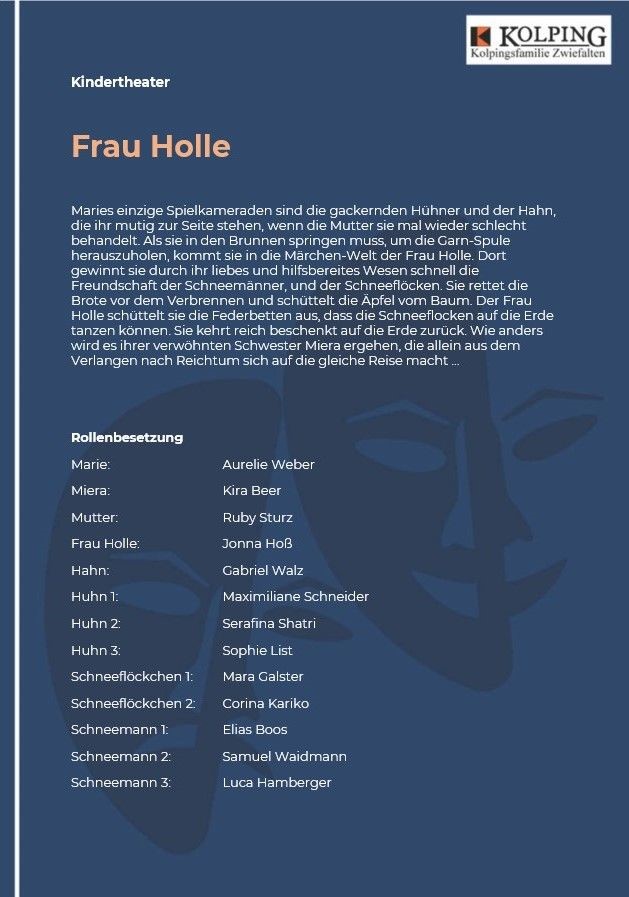 Auch in diesem Jahr dürfen Sie auf unsere Nachwuchsschauspieler gespannt sein. Frau Holle wird von den SchülerInnen der Grundschulklassen 3&4 der Münsterschule aufgeführt. Lassen Sie sich in die Märchenwelt entführen!